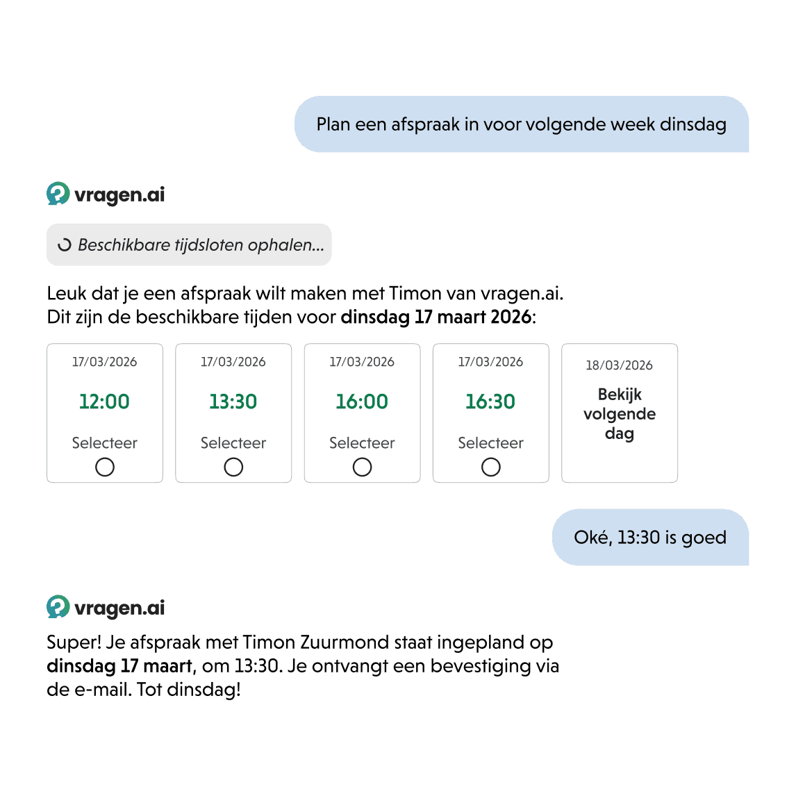 Het antwoord is dan niet langer: “Klik hier om verder te gaan.” Het antwoord is de vervolgstap. De gebruiker ziet beschikbare tijdsloten, past aantallen aan of bevestigt een keuze, zonder het gesprek te verlaten. Conversatie en interface vallen samen.