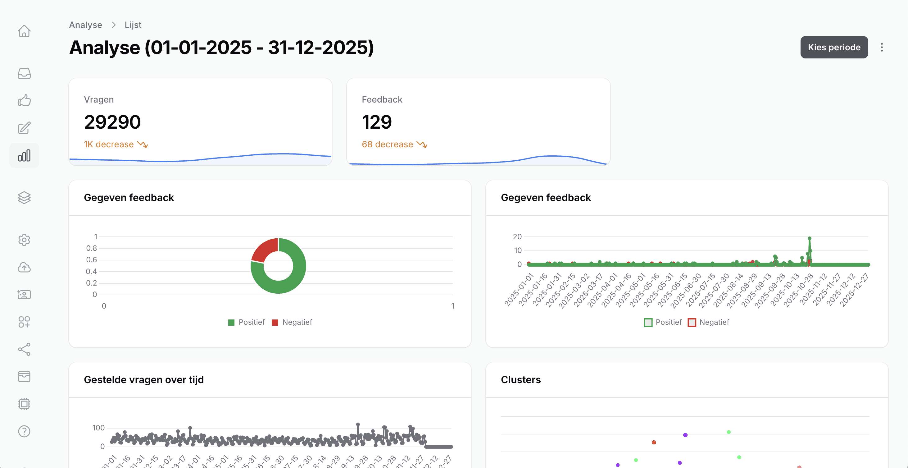 Onder het tabblad Analyse vind je een geclusterde samenvatting van alle gestelde vragen. In duidelijke grafieken zie je waar de meeste vragen over gaan én hoe bezoekers de antwoorden ervaren. Zo herken je sneller waar bezoekers goed geholpen worden en waar nog verbetering mogelijk is.